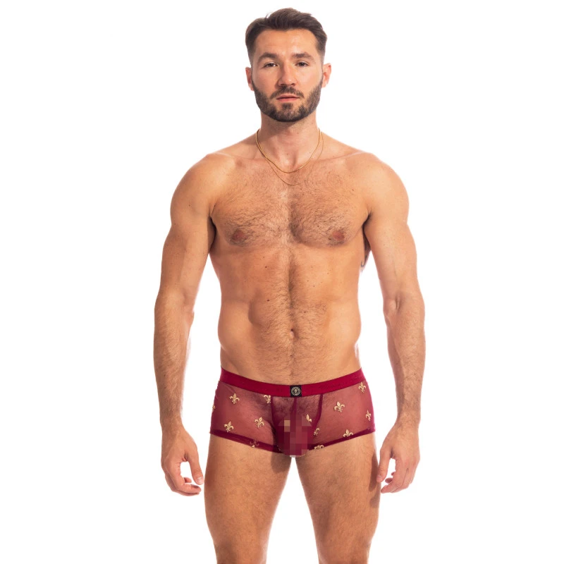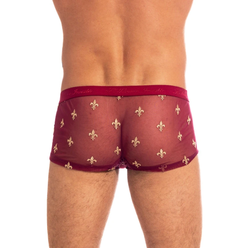 Pièce phare de L’Homme Invisible, le boxer Hipster Push Up se décline maintenant pour la collection Charlemagne Rouge. Les motifs satinés Fleurs de Lys brodés viennent se glisser sur un voile rouge transparent offrant ainsi une lingerie délicate et sensuelle. Ces motifs de royauté faits d’une broderie élégante, s’opposent à une transparence sensuelle. Ils ressortent ainsi pour accentuer les reliefs. Une envie irrésistible de caresser cette matière se fait alors sentir.