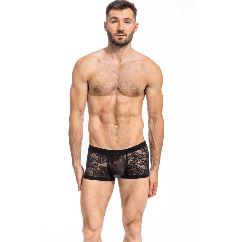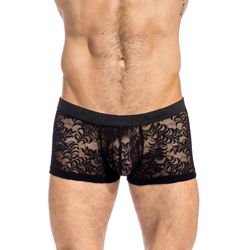 Boxer homme push-up plein de séduction en dentelle noire, sa poche u ergonomique devant est non-doublée pour pleinement apprecier les jolis motifs transparents de cette dentelle romantique fabriquée en Italie