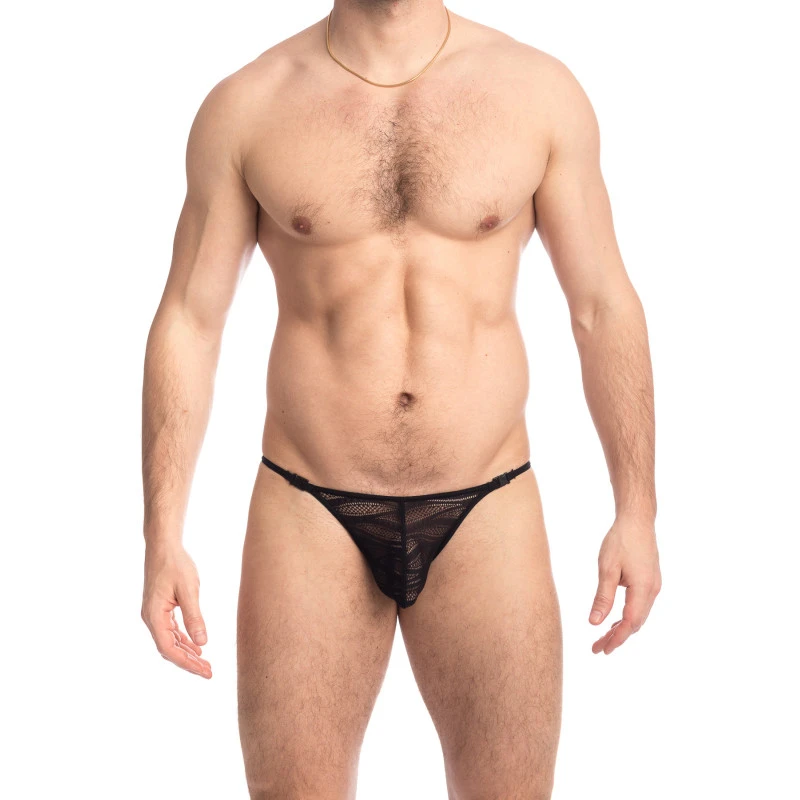 String homme façon striptease en dentelle noir hautement masculine fabriquée en Italie, Les motifs très graphiques ajourés sont d’une virilité avérée.