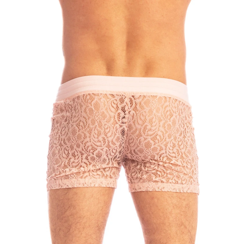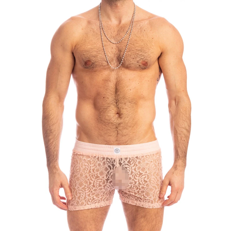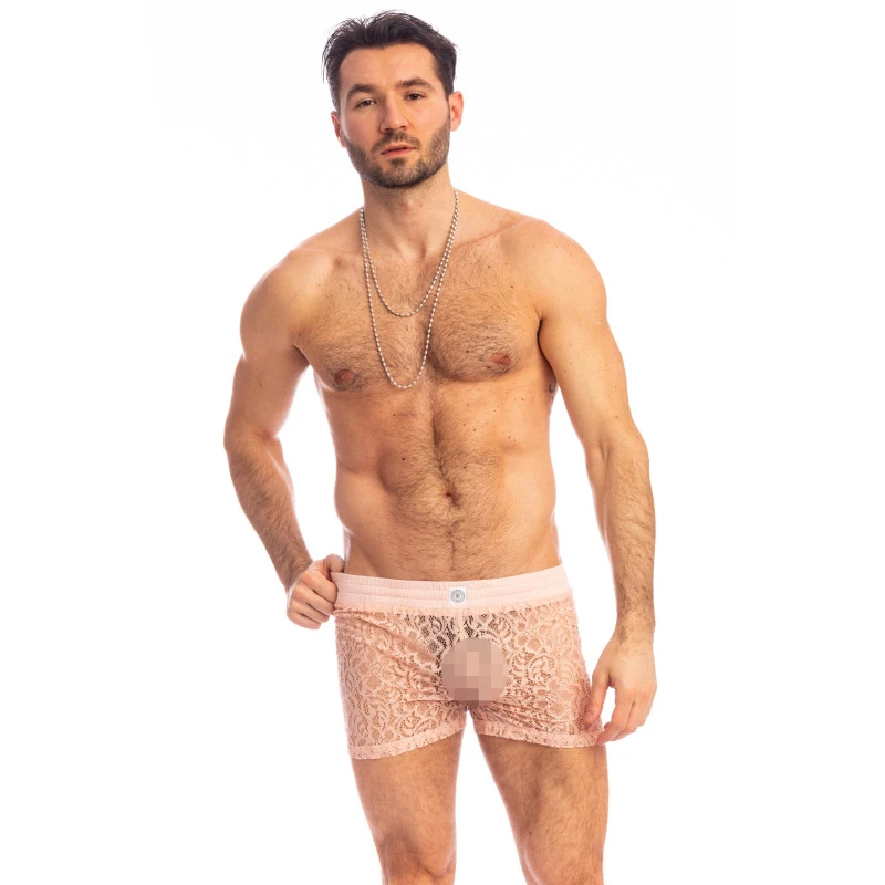 Short Lounge homme Fleur D’éther, légèrement transparent en dentelle fine et sublime au poids plumes au motifs romantique faits de l’arabesque et des volutes florales. Personne ne sait sublimer le corps masculin comme L’Homme Invisible le sait faire ! Corps d’un homme sous le voile de dentelle devient sensuel, raconte une poésie, apporte une douceur et se transforme en une arme de séduction !