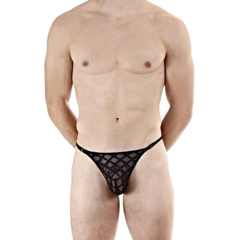 String homme façon striptease en dentelle noir aux motifs géométrique, la couture devant est remplacé par une pince pour ne pas gêner votre intimité, et la poche reste non-doublée pour mieux apprécier la sublime transparence de cette dentelle masculine et graphique.