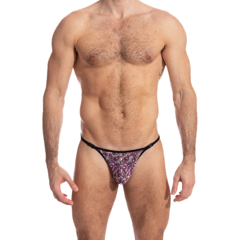 Strinhg Striptease en dévoré imprimé, une association unique des couleurs originales sur un fond légèrement transparent couleur nude.