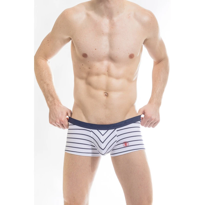 Avec le retour de l’intemporelle marinière, optez pour un look marin sexy. Une parfaite association entre les rayures bleues marines, le fond blanc et le médaillon rouge pour un boxer homme tendance.