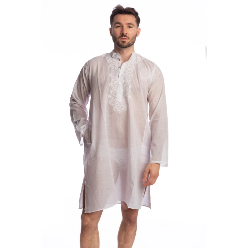 Chemise de nuit homme entièrement brodée main en voile de coton, un travail minutieux accompli par des artisans en Inde.