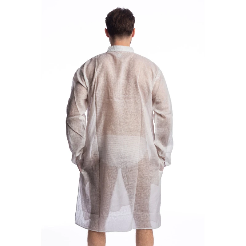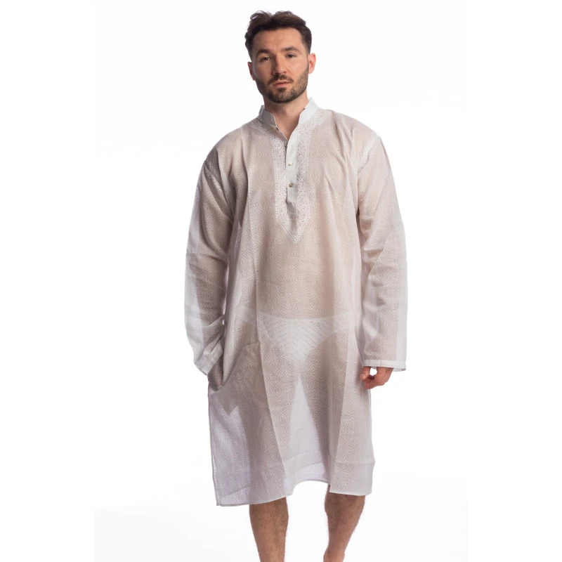 Chemise de nuit homme entièrement brodée main en voile de coton, un travail minutieux accompli par des artisans en Inde.