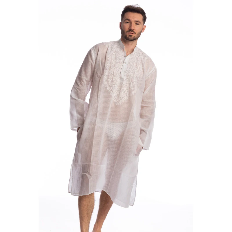Chemise de nuit homme entièrement brodée main en voile de coton, un travail minutieux accompli par des artisans en Inde.
