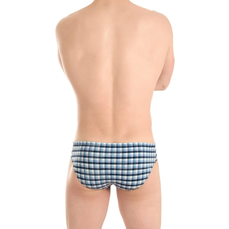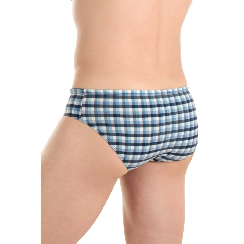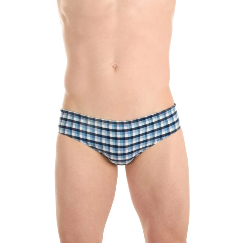 Mini slip de bain homme en vichy marine fils-teints fabriqué en France, création de l’homme invisible en coupe bikini homme taille basse parfaite pour bronzer à la plage ou au bord de la piscine!
