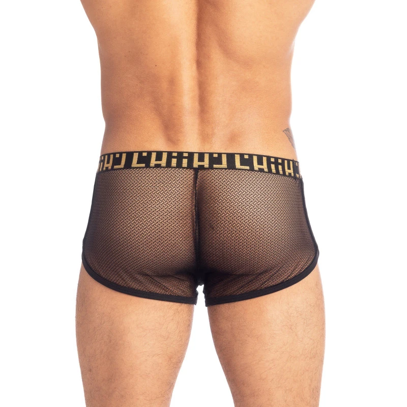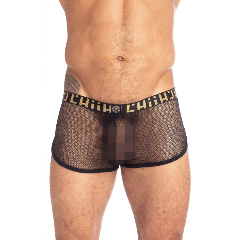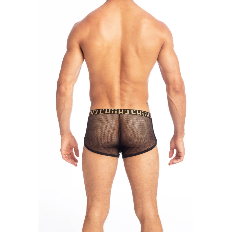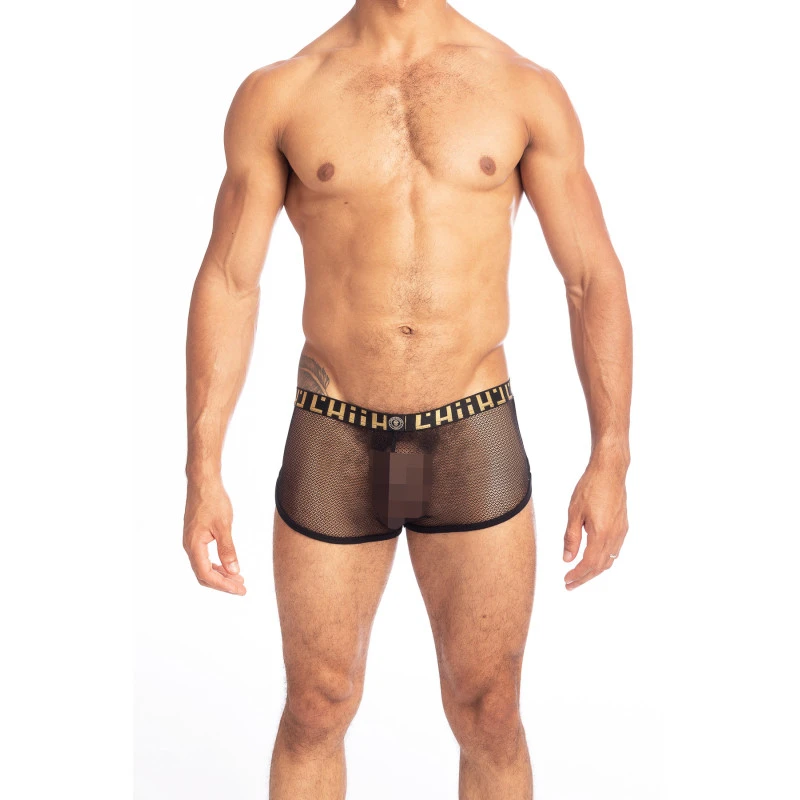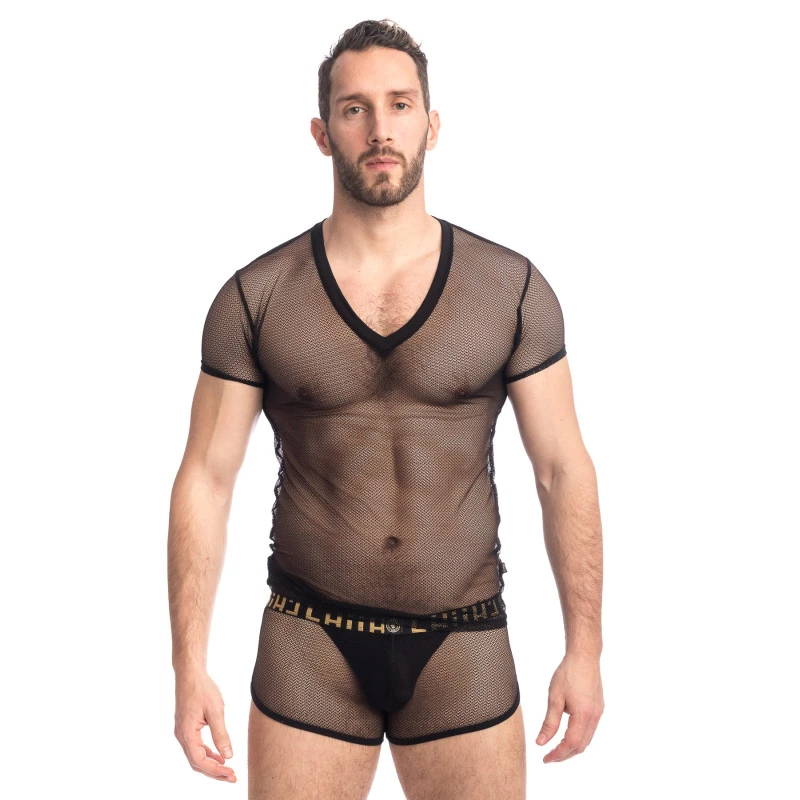 Les côtés sont arrondis tel un short homme de sport pour un mouvement sans contraint et bordé d’un biais pour un bon maintien et un look viril. Le short est sans doublure ni poche intérieure pour un maximum de liberté. Complétez-le avec le T-shirt Fishnet ou un débardeur noir. Il peut être également associé avec un jockstrap.